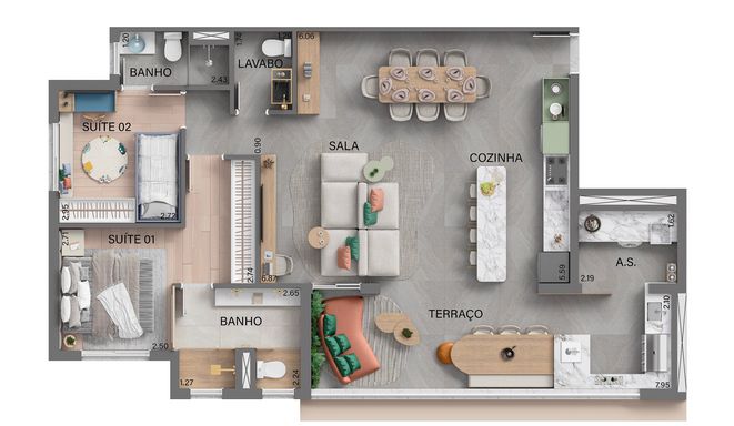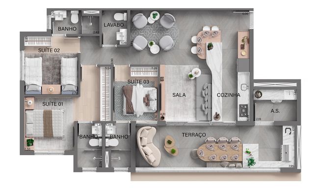 A planta de 105 m² com 3 suítes foi cuidadosamente desenvolvida para quem valoriza conforto e privacidade em todos os ambientes. O projeto inteligente otimiza cada metro quadrado, garantindo excelente distribuição dos espaços, integração entre áreas sociais e praticidade para o dia a dia da família.