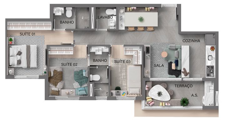 A planta de 74 m² com 3 suítes foi cuidadosamente desenvolvida para quem valoriza conforto e privacidade em todos os ambientes. O projeto inteligente otimiza cada metro quadrado, garantindo excelente distribuição dos espaços, integração entre áreas sociais e praticidade para o dia a dia da família.