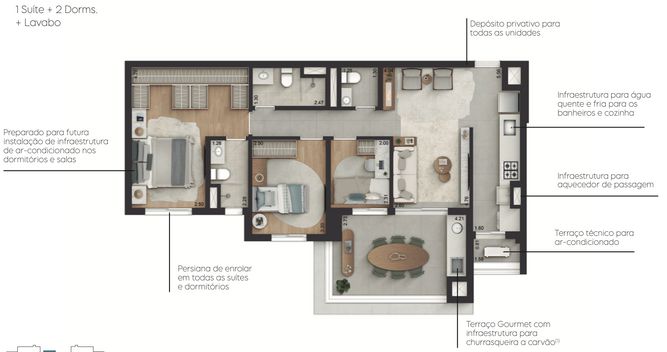 A planta inteligente integra os ambientes de forma harmoniosa, garantindo excelente aproveitamento dos espaços, iluminação natural e uma atmosfera acolhedora para viver e receber. Cada detalhe foi pensado para elevar a experiência de morar bem, com suíte que proporciona tranquilidade e liberdade no dia a dia.