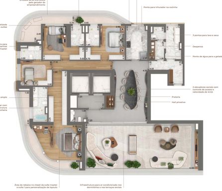 A tipologia contempla 4 suítes, hall privativo, 4 vagas de garagem e acabamentos de altíssimo padrão.