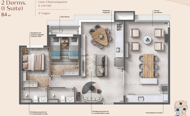 Este lançamento de 84 m² foi cuidadosamente planejado para proporcionar amplitude e bem-estar em cada detalhe. Com 2 dormitórios, sendo 1 suíte, o apartamento entrega uma planta inteligente que valoriza a integração dos ambientes, criando um espaço ideal tanto para momentos de convivência quanto para o seu descanso.